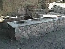 In Pompeii, 158 thermopolia with service counters have been identified throughout the town. They were concentrated along the main axis of the town and the public spaces where they were frequented by the locals.[7]