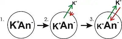 A diagram showing the progression in the development of a membrane potential from a concentration gradient (for potassium). Green arrows indicate net movement of K+ down a concentration gradient. Red arrows indicate net movement of K+ due to the membrane potential. The diagram is misleading in that while the concentration of potassium ions outside of the cell increases, only a small amount of K+ needs to cross the membrane in order to produce a membrane potential with a magnitude large enough to counter the tendency of the potassium ions to move down the concentration gradient.
