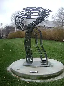Reunion, a public sculpture by Don Gummer, is located on the Indiana University-Purdue University Indianapolis campus, located near downtown Indianapolis, Indiana. The sculpture consists of two interlocking metal forms that have separate bases that eventually unite with one another. Reunion is located on the east side of the Herron School of Art and Design and is approximately 253 cm in height and approximately 167 cm wide. Reunion was created in 1992 as a model for a larger Reunion sculpture located in Japan. Reunion is made from cast bronze.