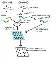 Reverse Northern blot, much like the northern blot upon which it is based, is used to determine levels of gene expression in particular tissues. In comparison to the Northern blot, the reverse northern blot is able to probe a large number of transcripts at once with less specificity with regard to probes than is required for Northern blot.[4] Often this will involve the use of suppression subtractive hybridization (SSH) libraries or differential display to isolate differentially expressed transcripts and create bacterial clones containing inserts for these sequences. These will serve as the targets hybridized to the membrane and will be probed by sample RNA. Expression levels can be quantified by increase or decrease in fluorescent or radioactive signal over a control treatment.[3] Bands or dots which appear darker and larger signify transcripts which are over-expressed in a sample of interest and lighter dots indicate that a transcript is down-regulated versus a control sample.