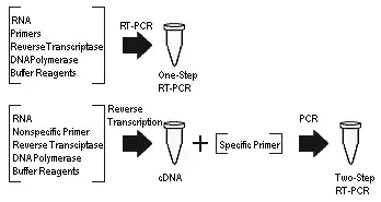 The quantification of mRNA using RT-PCR can be achieved as either a one-step or a two-step reaction. The difference between the two approaches lies in the number of tubes used when performing the procedure. The two-step reaction requires that the reverse transcriptase reaction and PCR amplification be performed in separate tubes. The disadvantage of the two-step approach is susceptibility to contamination due to more frequent sample handling.[19] On the other hand, the entire reaction from cDNA synthesis to PCR amplification occurs in a single tube in the one-step approach. The one-step approach is thought to minimize experimental variation by containing all of the enzymatic reactions in a single environment. It eliminates the steps of pipetting cDNA product, which is labor-intensive and prone to contamination, to PCR reaction. The further use of inhibitor-tolerant polymerases, polymerase enhancers with an optimized one-step RT-PCR condition, supports the reverse transcription of the RNA from unpurified or crude samples, such as whole blood and serum.[20][21] However, the starting RNA templates are prone to degradation in the one-step approach, and the use of this approach is not recommended when repeated assays from the same sample is required. Additionally, the one-step approach is reported to be less accurate compared to the two-step approach. It is also the preferred method of analysis when using DNA binding dyes such as SYBR Green since the elimination of primer-dimers can be achieved through a simple change in the melting temperature. Nevertheless, the one-step approach is a relatively convenient solution for the rapid detection of target RNA directly in biosensing.