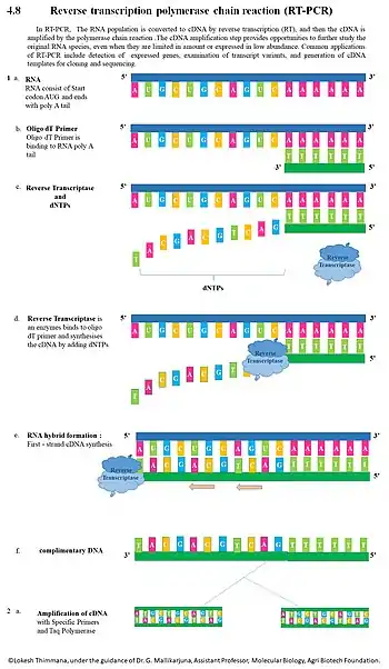 Reverse transcription polymerase chain reaction (RT-PCR) is a laboratory technique combining reverse transcription of RNA into DNA (in this context called complementary DNA or cDNA) and amplification of specific DNA targets using polymerase chain reaction (PCR).[1] It is primarily used to measure the amount of a specific RNA. This is achieved by monitoring the amplification reaction using fluorescence, a technique called real-time PCR or quantitative PCR (qPCR). Combined RT-PCR and qPCR are routinely used for analysis of gene expression and quantification of viral RNA in research and clinical settings.