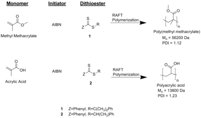 Figure 3 provides a visual description of RAFT polymerizations of poly(methyl methacrylate) and polyacrylic acid using AIBN as the initiator and two RAFT agents.