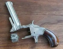 The first top-break revolver was patented in France and Britain at the end of December in 1858 by Devisme.[41] The most commonly found top-break revolvers were manufactured by Smith & Wesson, Webley & Scott, Iver Johnson, Harrington & Richardson, Manhattan Fire Arms, Meriden Arms, and Forehand & Wadsworth.[42]
