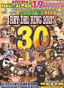 The Mexican professional wrestling company International Wrestling Revolution Group (IWRG; at times referred to as Grupo Internacional Revolución in Mexico) started their annual Rey del Ring ("King of the Ring") event in 2002, creating an annual event around the eponymous Rey del Ring match, a 30-man elimination match similar in concept to the WWE's Royal Rumble match.[1][2] From 2002 until the 2011 event the "prize" for winning the match itself was simply the prestige of outlasting 29 other competitors, but at the 2011 Rey del Ring IWRG introduced the IWR Rey del Ring Championship complete with a belt to symbolize the championship that would be awarded to the winner each year.[3] At that point in time the Rey del Ring title became a championship that could be defended and lost or won in matches in between the annual tournaments. For the tournament the champion would vacate the Rey del Ring Championship prior to the actual Rey del Ring match itself.[4] All Rey del Ring shows, as well as the majority of the IWRG shows in general are held in "Arena Naucalpan", owned by the promoters of IWRG and their main arena. The 2013 Rey del Ring was the eleventh over all Rey del Ring tournament held by IWRG.