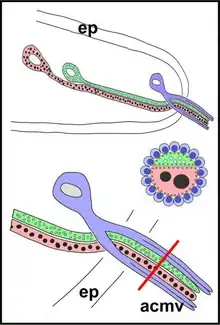 Scheme of the duo-gland adhesive system of the rhabditophoran Macrostomum lignano: red = adhesive gland; green = releasing gland; blue = anchor cell; ep = epidermis; acmv = anchor cell microvilli.