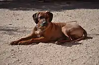 After initially greyer, rough-coated litters originating from Helm's dogs, van Rooyen's subsequently crossed offspring turned to redder coats, incorporating the Khoikhoi landrace dog's ridges already carried in Boer dogs within his genomes.[9] They became the foundation stock of a kennel which developed dogs over the next 35 years with the ability to bay a lion, to not attack it outright but to harass it by darting in and out with quick snaps and confusing the animal until the hunter shot it.[10] These dogs were used to hunt lions, boars and other big game as well as to clear farmlands of wild pigs and baboons, and they can kill a baboon independently of a human hunter's collaboration.[11][12]