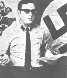 The Rhodesian White People's Party (RWPP) was a Rhodesian neo-Nazi political party led by James Kenneth "Ken" Rodger and the organizing secretary Frederick Lewis.[2] The movement was founded in Bulawayo on 30 January 1976;[2] it mainly inspired the American Nazi Party and later with it the National Socialist White People's Party to prevent the black rule in Rhodesia.[3][4] It was outlawed in November 1976 by the government of Ian Smith for anti-Semitic incidents by US citizens who were members of the party against the Bulawayo Hebrew Congregation. Among the expelled citizens were the neo-Nazis Eric Thompson and Harold Covington.[5] This political party was the only one of the World Union of National Socialists that was active in Africa.[6] Its main activity was distributing Nazi literature and harassing Jews in the area.[7] The group has been described by the Bishop Heinrich Karlen as having the "Nazi mentality of the superman".[8]