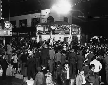 In the fall of 1916,[2] a 925-seat theater, the Southeast's largest movie house, opened in the Central Business District (and the original theater district) of Atlanta. The theater was named the "Rialto," which is defined as an exchange or a marketplace. The Rialto continued to operate throughout the Depression, and at one point even claimed to have the largest electric sign south of New York City above its marquee. In 1962, the original theater building was torn down, and a new 1,200-seat Rialto was built on the same site. It was the first movie theater to be constructed in downtown Atlanta in 35 years and remained open until 1989 before falling victim to a declining downtown economy.