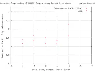 The Golomb–Rice coder is used in the entropy coding stage of Rice algorithm based lossless image codecs. One such experiment yields the compression ratio graph shown.