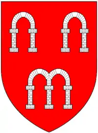 The estate of Arches within the manor of East Hendred in Berkshire had long been held by a family which was called Arches or D'Arches[7] Their heir was the family of Eyston. John Arches (d. circa 1405) of Arches was elected four-times as MP for Berkshire, in 1384, 1390, 1402 and 1404.[8] A family relationship between the Arches families of Arches and Eythrope, which both bore the same canting arms of Gules, three arches argent,[9] was suggested by Bertha Putnam in her work on Sir William Shareshull,[10] but as was remarked upon by Woodger, her suggestion that Sir Richard Arches (died 1417) was the son of Ralph Arches, son of John Arches (d. circa 1405) of East Hendred was clearly physically impossible.[1]