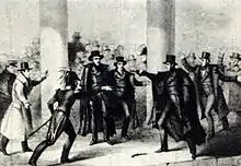 Lawrence's unsuccessful attempts were noticed by Jackson, who proceeded to beat him with his cane. The crowd, which included U.S. Representative Davy Crockett, eventually intervened and wrestled Lawrence into submission.[3] Lawrence was the first person to attempt an assassination of a sitting U.S. president.[7]