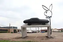 In 2013, he collaborated with Playboy magazine to create a roadside installation near Marfa, Texas; he mounted a black-painted 1970s muscle car on an inclined concrete plinth beside a large symbol from the magazine.[11]