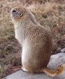 Typical adults are about 30 centimetres (12 in) long. Weights vary greatly with time of year and with location: at emergence from hibernation the squirrels weigh between 200 and 275 g (0.441–0.606 lb) for females and between 350 and 450 g (0.77–0.99 lb) for males. But by the time they hibernate again, their weight may have risen to nearly 750 grams (1.65 lb).[6] Males are slightly larger and heavier than females on average. They are dark brown on the upper side and tan underneath. The tail is shorter and less bushy than in other ground squirrels, and the external ears are so short as to look more like holes in the animal's head. Behavior is more like that of a prairie dog than a typical ground squirrel. The tail is constantly trembling, so the animal is sometimes called the "flickertail".[2]