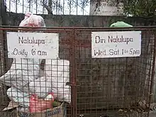 Signage in English and Rinconada in Baao; the Rinconada text means "biodegradable" and "non-biodegradable"