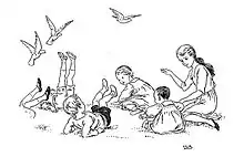 American children playing the game, an illustration by Jessie Willcox Smith from The Little Mother Goose (1912)