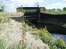 The first regulator to be installed was at Woodhouse Mill.[39] It is a vertical sluice gate, and is situated at the downstream end of the Woodhouse Mill washlands nature reserve. A railway embankment crosses the nature reserve, and flood arches allow the water to flood both sides of the tracks. There are no floodbanks between the river and the reserve, which results in it flooding soon after the gate is closed.[37] The mechanism here was manufactured by Ransomes and Rapier in 1956,[40] and the regulator was commissioned in 1959.[39] The Canklow regulator, situated close to the A630 link road from junction 33 on the M1 motorway, is also a vertical sluice gate, which when closed causes progressive flooding of seven washland areas on both sides of the M1, capable of holding 1,520,500 cubic metres (53,700,000 cu ft) of flood water.[37] It was installed in 1969 as part of a major road-building project, which saw the M1 motorway and the A630 road built across the washlands.[39]