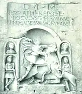 In an abandoned quarry below the church an ancient relief of the god Mithras sacrificing a bull, with the cult characteristic images of Cautes and Cautopates, Sol, a scorpion, a snake, a dog, and a raven, indicate this was the site of a late second-century Mithraeum.[4]