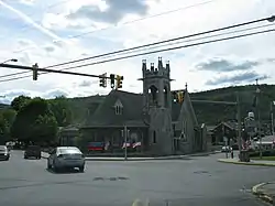 Daniel Mathias (D. M.) Bare laid out Roaring Spring's first 50 building lots in 1865 after he and two partners decided to locate the region's first paper mill near the spring.[3] These lots were located within and around the so-called village "triangle" defined by West Main, Spang, and East Main Streets. By 1873, the borough contained about 170 lots and 50 buildings, which included the paper and grist mills, three churches, a company store, a schoolhouse, and one hotel. The population stood at about 100. The triangle remained the industrial, commercial and retailing core of the town until 1957 when the bypass of East Main Street, PA Rt. 36, was built to the east of town through Taylor Township. As is true of many American small towns, many village merchants along with new businesses have since relocated to the new highway. The village core retains only a few shops and professional offices, but still holds the Roaring Spring Blank Book Company and Roaring Spring Water Bottling Company, all of the historic church buildings, the public library (the former Eldon Inn), the borough building, and the post office.[6]