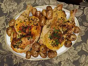 Oven roasted chicken is often served in the United States for special family meals including holidays such as Rosh Hashanah, Christmas and sometimes Easter or Thanksgiving. Considered a "comfort food" by many, oven roasted chicken had a resurgence of popularity in the mid to late 1990s as more restaurants and recipe publishers started to refocus on classic American fare.[5] The basic roasting process [6] involves removing the neck and giblets from the cavity, trussing the bird and folding the wings underneath, seasoning the skin and/or cavity, and then placing the bird in a pre-heated oven. The bird should be basted regularly, and is considered done when a meat thermometer registers 170°F for white meat or 185°F for dark meat.[7] It is commonly stuffed with oyster stuffing, chestnut stuffing or potato stuffing, or other varieties of stuffings.