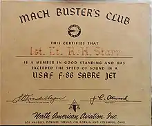 After his military service he flew P-51 and F-86's in the California Air National Guard. Spent a year on active duty with Air Defense off the southern California coast. During his duty with Air Defense Command he was scrambled to investigate bogies in radar range off the California coast. From Starr's memoirs page: "On several occasions, me and my wing man had visual confirmation of what could only be described as a UFO, mostly cigar shaped objects with no visible means of propulsion and yet each time we gave chase at full throttle, they left us behind as if we were standing still. I had many experiences with UFO sightings during my time with the Air National Guard".