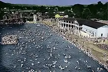 Rock Lake Pool was an outdoor swimming pool located in South Charleston, West Virginia operating from 1942 to 1985.[1] Being 550 feet (170 m) long, it was billed as "the largest and most beautiful pool in the East."[1] The pool was built in an old rock quarry in the 1930s[2] and opened by Joe, David, and Sam Wilan in 1942.[3] The pool was enclosed by tall natural rock walls that provided high dives. The pool was very popular in both West Virginia and neighboring states[4] and on one occasion, even drew a crowd of around 4,000 swimmers in one day.[4] After a long decline, the historic pool eventually closed in 1985 due to increased insurance cost[5] and competition from other pools.[1] The site is now owned by Rock Lake Presbyterian Church.[1]