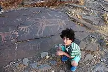 The ibex, a type of goat with prominent, curved horns, is the most common image depicted in rock art.[5] Human figures are portrayed dressed and undressed, performing rituals, roping cattle, walking on foot, riding horses, and hunting.