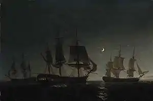 ![]() The East Indiaman, Rockingham , being floated off a shoal in the Red Sea, on the night of 8 June 1801, by Nicholas Pocock | |