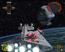 The heads-up display features a health meter, a radar, an ammunition count for secondary weapons and the "command cross" that allows the player to give limited instructions to their wingmen via the GameCube controller's D-pad.[3] The player can control seven craft in the base game: X-wing, A-wing, Y-wing, B-wing, Snowspeeder, the T-16 Skyhopper and the Millennium Falcon. Each vehicle offers a unique armament arrangement, as well as varying degrees of speed and maneuverability.[4] The game initially restricts the player to a particular craft for each level; however, after a level has been completed, it can be replayed with any available craft.[5] Some levels offer the player the option to change craft mid-level.[6] Eleven bonus power-ups are hidden in different levels throughout the game. These bonuses improve a craft's weapons, durability, and targeting computer and are applied to each eligible craft for the remainder of the game.[7]