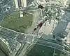 On 5 October 2004 during Chinese National Day Holiday, a multi-national group of BASE jumpers who were invited by the Shanghai Sports Bureau leapt from the top of the tower. The next day, Roland Simpson leapt from the Jin Mao Building, the tallest skyscraper in China at the time, in a wingsuit. After a good jump and flight, his parachute opened with multiple line twists making it difficult to steer and he crashed onto an adjacent building.[1] He went into a coma. He was then returned to Australia, where he died from his injuries in Canberra Hospital at 2:30pm AEST on 22 October 2004. He is number 85[2] on the BASE Fatality List.[3]