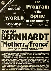 - ↑ "Sarah Bernhardt in Real War Film; "Mothers of France" from Scenario of Jean Richepin Moves Rialto Audience". The New York Times. March 12, 1917. Retrieved December 22, 2019.