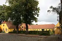 To the rear of the building is a cluster of low, yellow farm buildings located on three sides of a central courtyard.