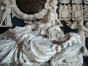 Verhulst is mainly remembered for this many tomb monuments for private and public patrons. His funeral monument for Maria van Reygersbergh of 1663 established his reputation in this area with its new and imposing style. He made many church monuments erected to commemorate Dutch naval heroes.[9] His chief work in this area (though possibly not his most successful creation) is the decorated tomb of the Dutch naval hero Michiel de Ruyter in the Nieuwe Kerk in Amsterdam. Another important tomb monument was that of Carl Hieronymus Baron van In- en Kniphuizen and Anna van Ewsum made for the Dutch Reformed church in Midwolde. It was made at the request of the widow of the Baron and was one of the few private commissions for tomb monuments in the Dutch Republic. It is a variation on the traditional double tomb, which combines two figures, the recumbent dead person, and the other living one raised on an elbow. The widow Anna van Ewsum takes centre stage by gazing straight at the viewer. A statue of the second husband of the widow made by Bartholomeus Eggers was later added to the tomb replacing two putti holding memento mori symbols.[12]
