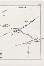 The branch is known colloquially as the "Romford Push and Pull" and has always been single-track throughout. The only structure of any note on the line is the bridge across the River Ingrebourne which is just over 100 feet (30 m) in length. When first opened the LT&SR constructed a separate station building at Romford where a cast-iron footbridge over South Street was provided to link to the GER station, this only being opened when an LT&SR train was due. This building itself was directly opposite the GER station entrance and was of 3 storeys with the booking hall on the ground floor and including accommodation for the stationmaster.[4] In April 1934 the LT&SR building ceased use as a station and the ground floor was rented as a shop and the London and North Eastern Railway, the successor of the GER, took control of the whole station. The barriers that had restricted access between the two stations at rail level were then removed. The branch has just one signal, on approach to Romford.