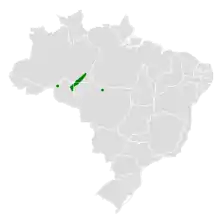 The Rondonia bushbird was first described near the Rio Jiparana, a tributary of the Rio Madeira in the Brazilian state of Rondônia.[2] Since then it has been documented at additional sites between the rios Madeira and Sucunduri to its east in the state of Amazonas, and also in Mato Grosso. It primarily inhabits lowland humid terra firme forest in locations with tangles of vines, a dense understory, and sometimes with Guadua bamboo. It has also been recorded in moderately disturbed forest and near recently logged areas, and once in campina. In elevation it is known only below 300 m (1,000 ft).[4][5][1]
