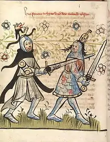The Rosengarten has long been read as a metaliterary text about German heroic poetry, with Michael Curschmann calling it "poetry about heroic poetry" ("Dichtung über Heldendichtung").[22] The poem contains numerous citations and allusions to various heroic traditions via objects such as swords and horses, as well as the names of various heroes.[23] Victor Millet takes the poem's mixing of various elements from other texts that could not occur at the same time as a sign of its citation of other heroic poems in order to comment on them.[24] Version D, moreover, cites or reverses many motifs of the historical Dietrich epics Dietrichs Flucht and the Rabenschlacht: Etzel seeks Dietrich, a reversal of Dietrich's exile at Etzel's court, and Dietrich increases Etzel's power by forcing Gibich to become his vassal. Witege, moreover, receives his horse Schemming and also asks to leave Dietrich's service due to Wolfhart's anger over this gift, foreshadowing his treachery and escape on Schemming in the Rabenschlacht. The text also contains an explicit allusion to Witege's role in Alpharts Tod.[25]