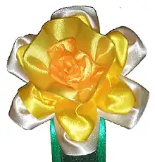 Award ribbons can be simply a flat piece of ribbon, a flat-folded ribbon, or fancier manipulations of the ribbon material, such as rosettes. A rosette consists of ribbon that is pleated or gathered and arranged in a circle so that it resembles a rose, usually with streamer ribbons attached. Some ribbon rosettes will also have loops, petals and star points as part of the design whilst using Satin ribbons, Velvet ribbons, Sheer ribbons, Lamé ribbons, Tartan ribbons and printed ribbons including personalised printed ribbons to promote the sponsor, event or the reason for giving.