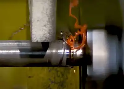 Photo of friction welded API 5L X46 pipeline with diameter of 220 mm and wall thickness of 8 mm.[9] The typically flash is visible on the image. However, there's the problem:Internal significant flash is visible here and can be difficult to remove in pipline.