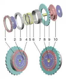 Exploded view of an Enigma machine rotor:1-Notched ring, 2-Dot marking the position of the "A" contact, 3-Alphabet "tyre" or ring, 4-Electrical plate contacts, 5-Wire connections, 6-Spring-loaded pin contacts, 7-Spring-loaded ring adjustment pin, 8-Hub, through which fits the central axle, 9-Finger wheel, 10-Ratchet mechanism