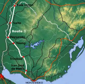 Route 3 is a national route of Uruguay. In 1975, it was assigned the name General José Artigas, the foremost national hero of Uruguay.[1] It is one of the most important highways in the country along with Route 5, connecting the south coast near Rafael Perazza with Bella Unión in the extreme northwest. The road is approximately 592 kilometres (368 mi) in length.[2][3]