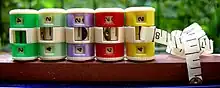 The luxury version of the Compact was presented in a gift box, it was priced at a guinea and became a contemporary collector's item, tending to be little-used due to impracticality. The assemblage included a thin and delicate 6-inch – later 8-inch – tape measure in place of the grip band.[lower-alpha 5] On this luxury version the tape-measure assembly caused the centre of the gadget to rotate independently, making it difficult for adult fingers to grip the remaining part of the stable outer skin to turn the main assemblage for use as a row counter.[1] Some of the counters in this range featured pearlised plastic outer skins in various pastel colours.[lower-alpha 6]