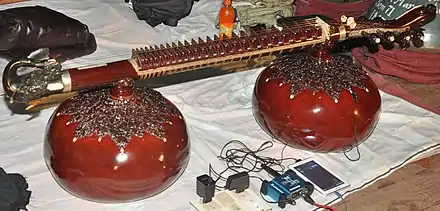 The Rudra veena (Sanskrit: रुद्र वीणा) (also spelled Rudraveena[1] or Rudra vina[2])—also called Bīn in North India[3]—is a large plucked string instrument used in Hindustani Music, especially dhrupad.[2] It is one of the major types of veena played in Indian classical music, notable for its deep bass resonance.[4]