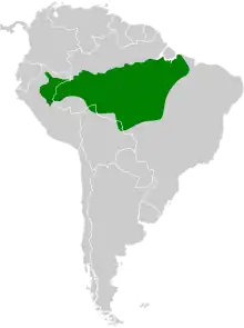 The rufous-necked puffbird is found in southern Amazonia. M. r. rufa occurs in northeastern Peru, northeastern Bolivia, and western Brazil south of the Amazon River and west of the Madeira River. M. r. brunnescens occurs in Brazil south of the Amazon and east of the Tapajós River to the Atlantic Ocean. Intergrades between the two subspecies occur between the Madeira and Tapajós. In most of its range it inhabits the understory of terra firme evergreen forest. In northeastern Peru it appears to be restricted to várzea forest.[3]