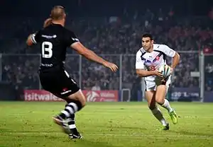 One of the main differences is the rules of possession.[25] When the ball goes into touch, possession in rugby union is contested through a line-out, while in rugby league a scrum restarts play. The lesser focus on contesting possession means that play focuses more on powerful running, hard tackling, forward progression and the contest for field position (commonly compared to an "arm wrestle"); as a result play stops much less frequently in rugby league,[26] with the ball typically in play for 50 out of the 80 minutes compared to around 35 minutes for professional rugby union.[27] Other differences include that there are fewer players in rugby league (13 compared to 15)[28][29] and different rules for tackling. Rugby union has more detailed rules than rugby league[30][31] and has changed less since the 1895 schism.[32]