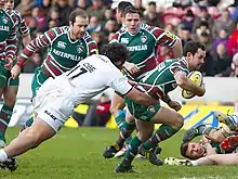 There is nothing in the Laws of Rugby Union that determines if or how players should be individually identified by marking their clothing. However, since 1967, player numbering has been standardised by World Rugby for international matches (1–15, with 1 being loosehead prop and 15 being the fullback; the replacements are then numbered from 16 onwards, with the forwards first from the front row to the number eight, followed by the backs from scrum-half to full-back).[2] English Premiership sides have also adopted this standard numbering system to better aid the understanding of spectators new to the sport, necessitating that Leicester abandon their traditional lettering system, though they have attempted to keep the tradition alive by printing a small letter appropriate to the player's position next to the club badge on the left breast.[3][4]