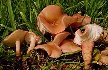 Rugosomyces carneus is a small pink-capped mushroom with white gills that can be found in grassy meadows, fields, or on lawns from spring to autumn in Europe and North America. Its common names include pink fairhead[2] and pink domecap.[3]