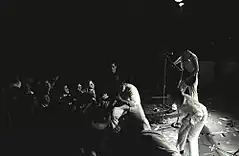 As teenagers inspired by the eruption of the American and British punk movement, the Wallis brothers and Adams began writing songs together around 1978. Several songs that became fixtures of Ruin's performances date to this early period, including their revved-up covers of Leonard Cohen.[1][lower-alpha 1] In what became a hallmark of Ruin, the early Wallis-Adams songs, while loyal to the hyper-rhythms and aggressive delivery of early punk and later hardcore, were just as likely to evoke the melancholia of American folk music or the frantic jam quality of psychedelic rock.[1] Incoming bassist Cordy Swope added elements of 1960s British invasion and American underground art rock to the band's mix of styles.[2] This eclecticism became a defining feature of the Philadelphia underground music scene of the 1980s and beyond, an environment that contributed to Ruin's success.[3][4][5] American author and urbanist Adam Greenfield noted: "Philadelphia threw nothing but curveballs. McRad, The Dead Milkmen, Pagan Babies, Scram: none of them quite fit the template, somehow. They were too weird, too goofy, too unpredictable, too hard to fit into the categories that were already then beginning to solidify."[6] Illustrating Ruin's own eclecticism, Greenfield adds, "Which brings us at last to Ruin...If you were lucky enough to see them play, you never forgot it. There were rugs. There were, no lie, candles. The band filtered onto the stage dressed in white from head to toe. The message was unmistakable: whatever it was you were about to witness, it wasn’t going to be yet another clutch of Black Flag wannabes, sounding off about their petty beefs with still pettier authorities."[7]