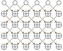 In the mathematical study of cellular automata, Rule 90 is an elementary cellular automaton based on the exclusive or function. It consists of a one-dimensional array of cells, each of which can hold either a 0 or a 1 value. In each time step all values are simultaneously replaced by the exclusive or of their two neighboring values.[1] Martin, Odlyzko & Wolfram (1984) call it "the simplest non-trivial cellular automaton",[2] and it is described extensively in Stephen Wolfram's 2002 book A New Kind of Science.[3]