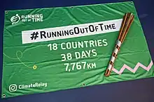 Running Out of Time is a relay event used to promote discussion about climate change.[1][2][3][4][5] It was the longest non-stop relay ever attempted with runners, cyclists and sailors working together to pass a baton hand-to-hand from COP26 in Glasgow to COP27 in Sharm El Sheikh.[6] The baton moved non-stop through 18 countries: UK, France, Belgium, Netherlands, Germany, Austria, Italy, Slovenia, Croatia, Bosnia and Herzegovina, Montenegro, Albania, Greece, Cyprus, Israel and Egypt.[7] The journey of 7,767 kilometres (4,826 mi) took forty days.[8]