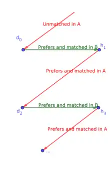 Now, consider what happens when the doctor d0 is unmatched in A. Now, the cycle cannot close since no hospital can be matched to d0 in A. It is also impossible that some hospital h3 in this cycle is unmatched in A, since if the hospital preferred to be unmatched than to be matched to its doctor in B, then B could not have been stable. This means that we have an infinite cycle, which cannot be. Hence, if d0 is unmatched in A, he must be unmatched in B too.